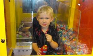 เรื่องมีอยู่ว่าเจ้าหนูคนนี้ถูกคุณแม่พาไปร่วมงานวันเกิดเพื่อนที่ภัตตาคารอาหารอิตาเลียนแห่งหนึ่ง ในเมืองเพิร์ต คุณแม่ปล่อยให้ลูกเล่นอยู่ในโซนเด็กเล่น บังเอิญโซนนั้นมีตู้ลูกกวาดหยอดเหรียญตั้งอยู่ ด้วยความอยากกินลูกกวาดเจ้าหนูหาทางมุดเข้าตู้จนได้ เข้าไปนั่งกินสบายใจ แต่พอจะออกกลับหาทางออกไม่ได้ ฝ่ายคุณแม่ยังสาวมองหาลูกชายเห็นว่าติดอยู่ในตู้ลูกกวาดก็ตกใจโทรหาพ่อของเด็กและหาทางช่วยให้ลูกออกจากตู้ ส่วนบรรดาแขกเหรื่อที่มาร่วมงานต่างก็มามุงดูเพราะเห็นเป็นเรื่องแปลก ...5555