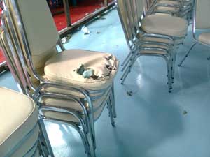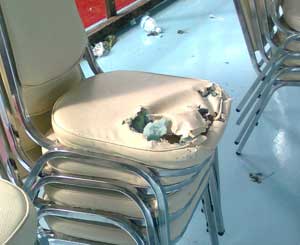 เมื่อวานนี้ ให้เด็กๆเดินเก็บเก้าอี้และโต๊ะที่วางทิ้งไว้ด้านล่างขึ้นเก็บ ปรากฏว่า โต๊ะหายไป 12 ตัว เก้าอี้หายไป 16 ตัว ยังไม่ได้สำรวจว่าไปตกค้างอยู่ที่ใด