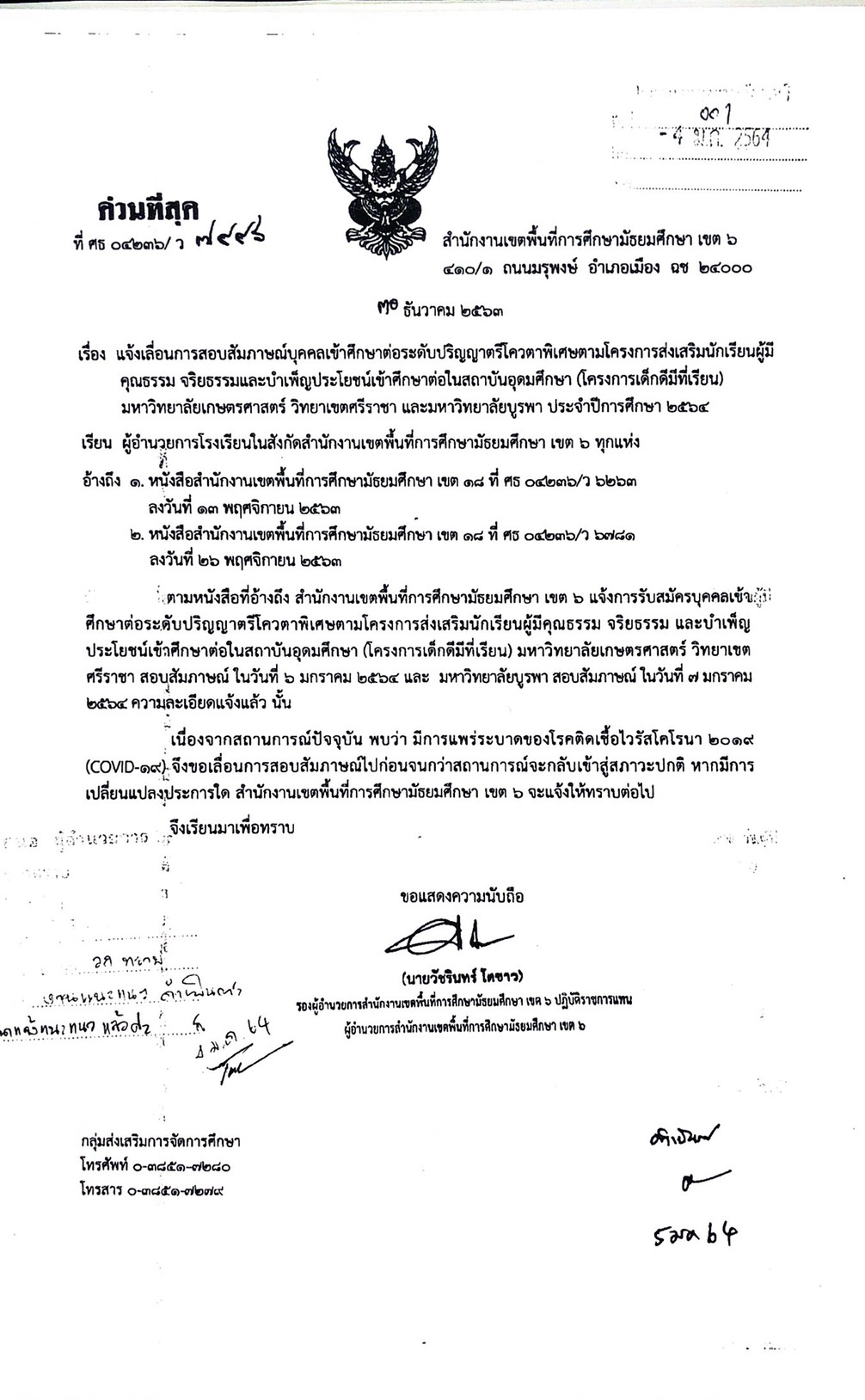 แจ้งเลือนการสอบสัมภาษณ์ บุุบลเข้าศึกษษต่อระดับปริญญาตรีโควต้าพิเศษตามโครงการส่งเสริมนักเรียน(โครงการเด็กดีมีที่เรียน)