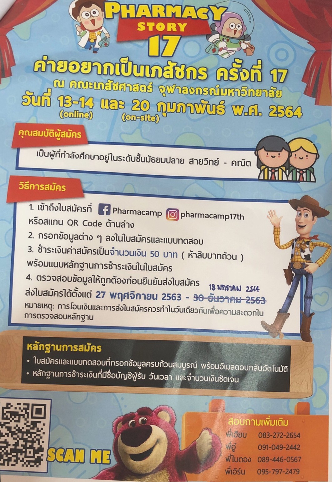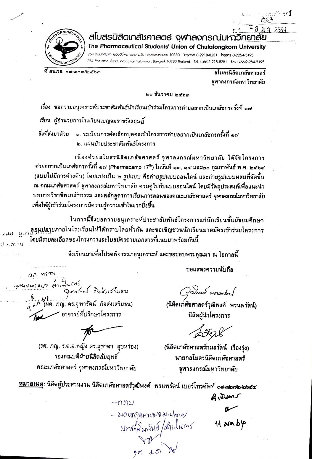 เนื่องด้วยสโมสรนิสิตเภสัชศาสตร์ จุฬาลงกรณ์มหาวิทยาลัย ได้จัดโครงการค่ายอยากเป็นเภสัชกร ครัง้ที่ 17 ในวันที่ 13,14 และ 20 กุมภาพันธ์ พ.ศ. 2564 โดยแบ่งเป็น 2 รูปแบบ คือค่ายออนไลน์ และค่ายรูปแบบผสม ณ คณะเภสัชศาสตร์จุฬาลงกรณ์มหาวิทยาลัย