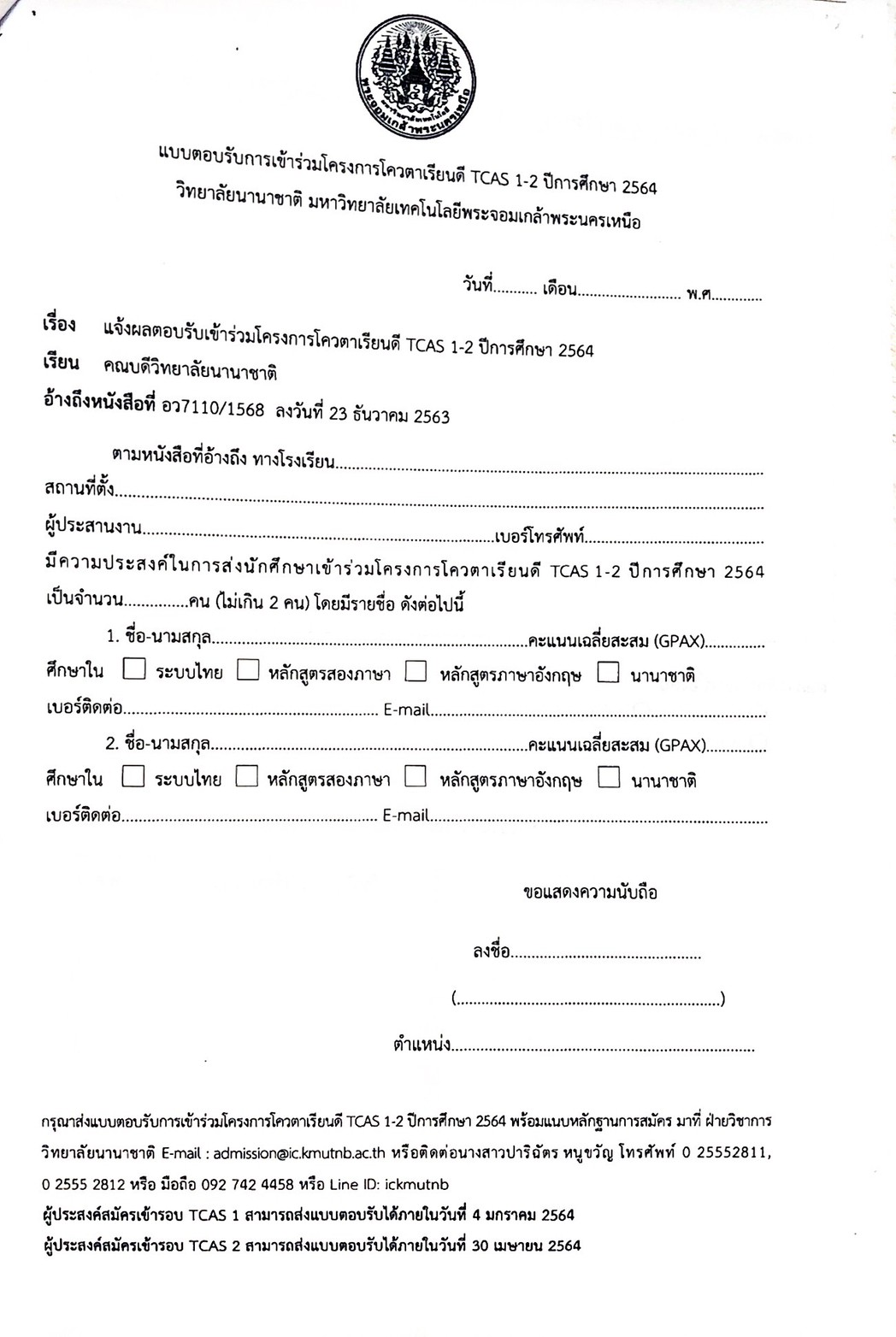 ปีการศึกษา 2564 วิทยาลัยนานาชาติ มจพ. ได้ดำเนินการเปิดรับนักศึกษาใหม่ ตามระบบ TCAS โดยประกอบไปด้วย TCAS 1รับสมัครในระว่างวันที่ 9 ตุลาคม 2563 -4 มกราคม 2564 และ TCAS 2 รับสมัครในระหว่างวันที่ 29 มกราคม -30 เมษายน 2564 เอกสารตามแนบ