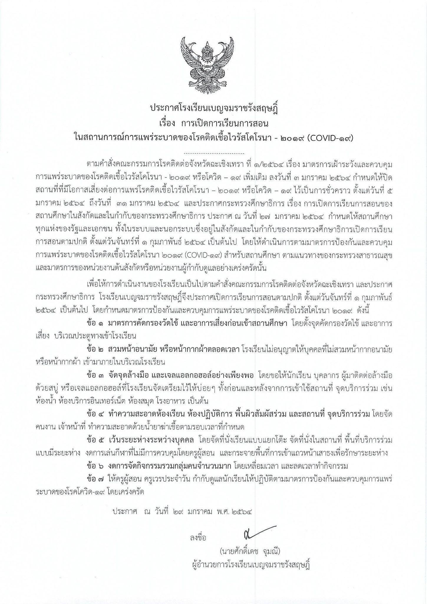 ประกาศ การเปิดการเรียนการสอนในสถานการณ์การแพร่ระบาดของโรคติดเชื้อไวรัสโคโรน่า 2019 (COVID-19) ตั้งแต่วันจันทร์ที่ 1 กุมภาพันธ์ พ.ศ.2564 โดยกำหนดมาตรการป้องกันและควบคุมการแพร่ระบาดของโรคติดเชื้อไวรัสโคโรน่า 2019 ตามรายละเอียดในเอกสารแนบ