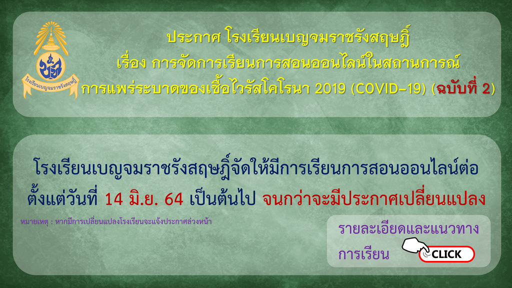โรงเรียนเบญจมราชรังสฤษฎิ์ ประกาศเรื่องการจัดการเรียนการสอนออนไลน์ในสถานการณ์ การแพร่ระบาดของเชื้อไวรัสโคโรนา 2019 (COVID-19) ฉบับที่ 2