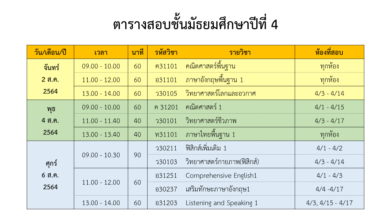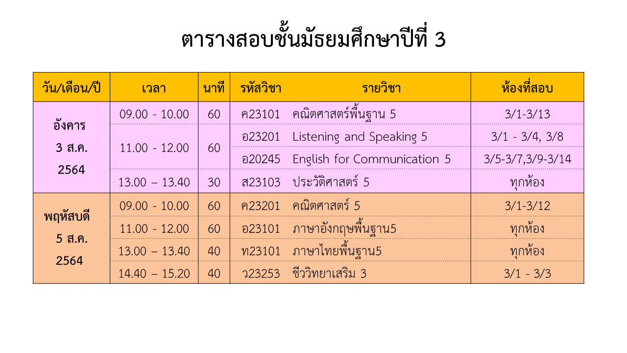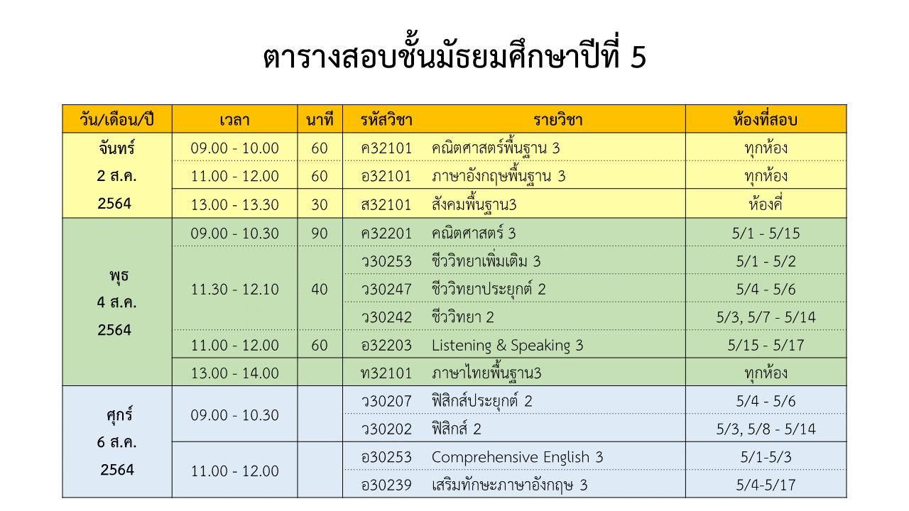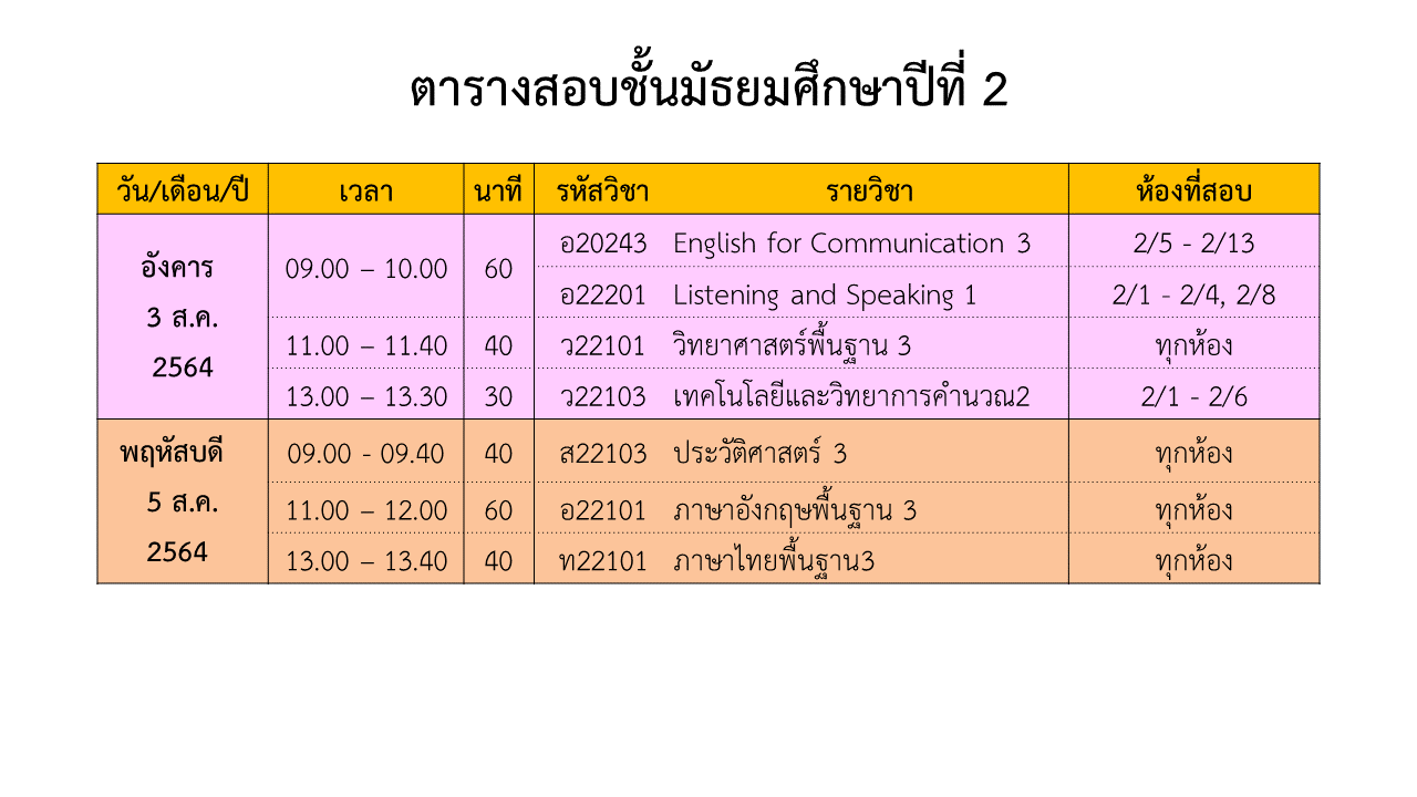 กำหนดการสอบวัดผลกลางภาคเรียนที่ 1/2564