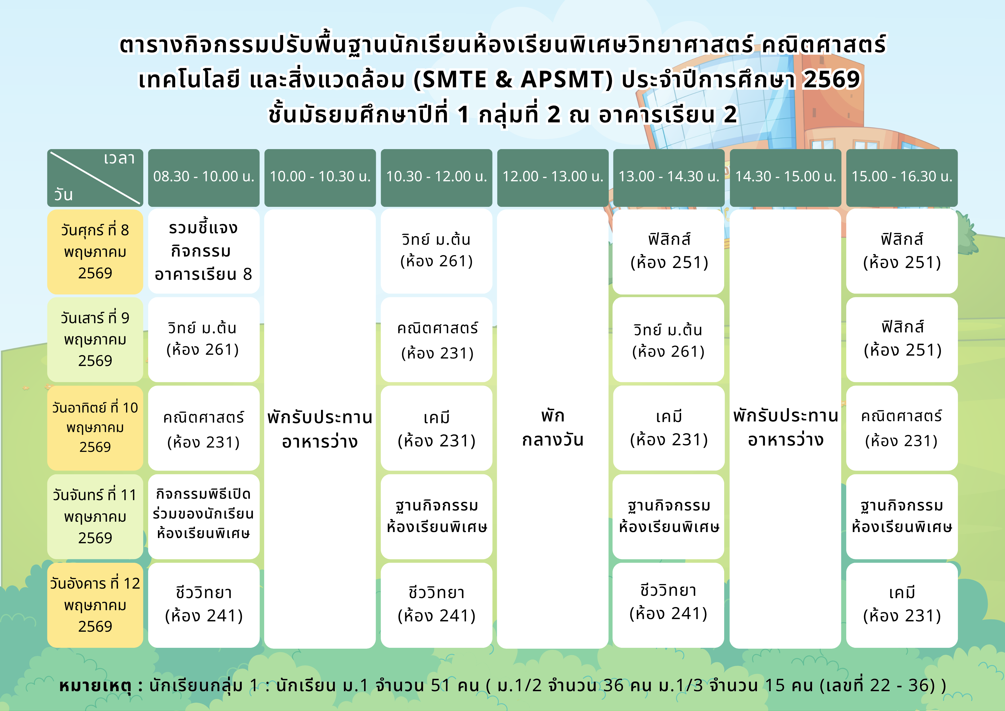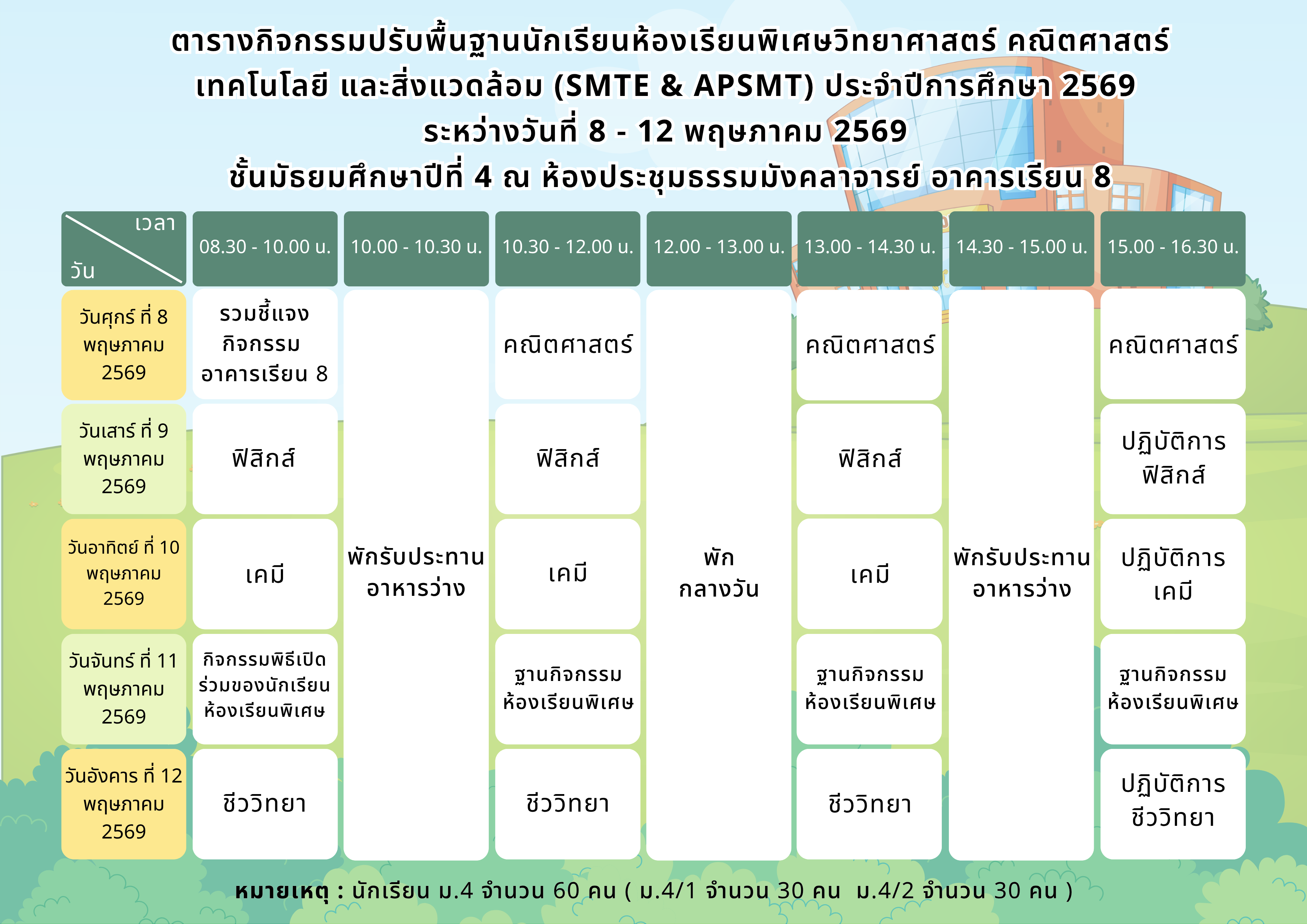 ว่าที่ ร.ต. เกชา กลิ่นเพ็ง ผู้อำนวยการโรงเรียนเบญจมราชรังสฤษฎิ์ เป็นประธานเปิดกิจกรรมอบรมเตรียมความพร้อมการเข้าค่ายโอลิมปิกวิชาการ ค่าย 2 วิชาวิทยาศาสตร์โลกและอวกาศ และคณิตศาสตร์ ประจำปีการศึกษา 2568 ระหว่างวันที่ 78 มีนาคม พ.ศ. 2569 ณ ห้องประชุมธรรมมังคลาจารย์ อาคาร 8