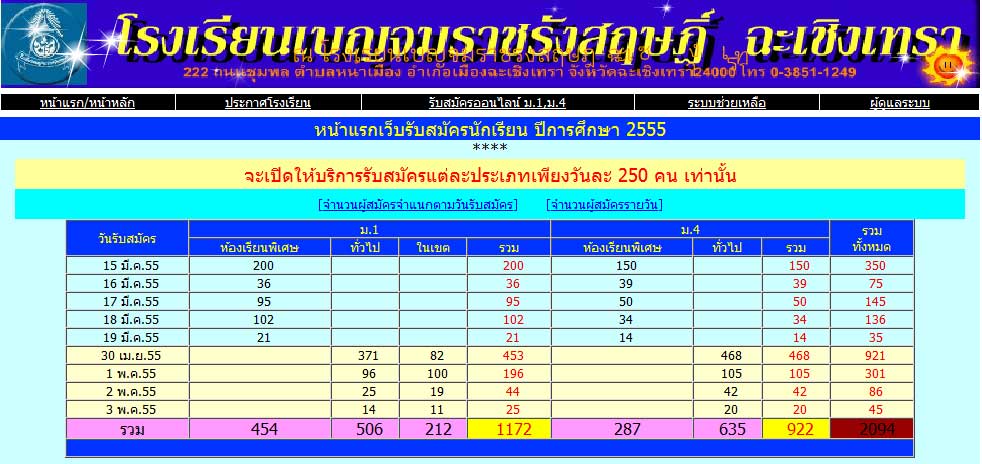 Newsจากการสำรวจสถิติการกรอกใบสมัครเข้าสอบแข่งขันเพื่อเข้าเรียนที่โรงเรียนเบญจมราชรังสฤษฎิ์ ในปีการศึกษา 2555 ทั้งห้องเรียนพิเศษ และห้องเรียนปกติ ในปีนี้มีแนวโน้มว่าจำนวนผู้มาสมัครไม่มากไม่น้อยไปกว่าปีที่ผ่านมา ด้วยปัจจัยที่ผู้ปกครองและนักเรียนบางคนอาจจะมองว่าเรียนที่โรงเรียนอื่นๆหรือโรงเรียนใกล้บ้านน่าจะดีและเหมาะสมกว่า ไม่ต้องแข่งขันกันมากมาย ดูจากสถิติวันนี้ (12 มีนาคม 2555) ห้องเรียนพิเศษ ม.ต้น สมัครไว้จำนวน 454 คน ม.ปลายจำนวน 287 คน ส่วนห้องเรียนปกติ ม.ต้นจำนวน 718 คน ม.ปลายจำนวน 635 คน