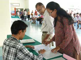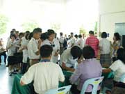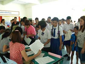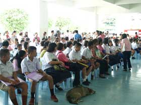 วันนี้ (8 พ.ค. 55) เป็นวันที่นักเรียนที่สมัครสอบกับโรงเรียนเบญจมฯเพื่อเข้า ม.1 ต่างตื่นเต้นโดยเฉพาะนักเรียนที่รู้ว่าสอบได้และมีชื่อในประกาศของโรงเรียน ต่างทยอยเดินทางมาโรงเรียนเพื่อรายตัวยืนยันสิทธิ์เข้าเรียนตั้งแต่เช้า โดยนั่งคอยเวลารายงานตัวที่บริเวณใต้อาคารสมเด็จพระเทพฯ และเมื่อถึงเวลา 9.00 น. ต่างเข้าคิวลงชื่อรายงานตัวกันอย่างเป็นระเบียบเรียบร้อย ใช้เวลาไม่นานพื้นที่รับรายงานตัวก็ว่างเปล่า เนื่องจากทุกคนต่างพากันเดินทางกลับบ้าน หลายๆคนอาจพาลูกหลานไปฉลองความยินดีกับเด็กๆที่สอบได้ตามศูนย์อาหารต่างๆในแปดริ้ว