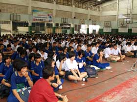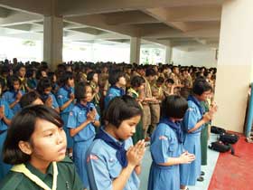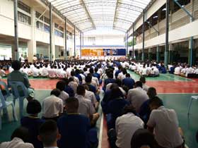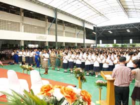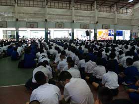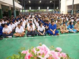 วันนี้(13 มิย.55) ฝ่ายบริหารบุคคลนำโดยรองฯเสน่ห์ ศุภอักษร และคณะครูในระดับต่างๆทุกระดับ ได้จัดให้นักเรียนทั้งหมดลงไปซักซ้อมพิธีไหว้ครูที่บริเวณสนามโรงพลศึกษาและใต้อาคารสมเด็จพระเทพฯ ซึ่งงานอาคารสถานที่ได้ดำเนินการจัดตั้งเวทีและประดับตบแต่งบริเวณไว้แล้ว การซักซ้อมเพื่อดำเนินตามขั้นตอนพิธีการนี้ฝ่ายบริหารบุคคลได้ดำเนินการมาทุกปี เพื่อเตรียมตัวนักเรียนให้รับรู้ขั้นตอน และเพท่ความเป็นระเบียบเรียบร้อย ในขณะที่นักเรียนส่วนใหญ่ดำเนินการซักซ้อมอยู่นั้น จะมีนักเรียนอีกจำนวนหนึ่งที่มีความคิดสร้างสรรด้านศิลปะประดิษฐ์ของแต่ละห้อง ไปจัดทำพานไหว้ครูกันอยู่ที่โรงเล่นวอลเล่ย์บอล