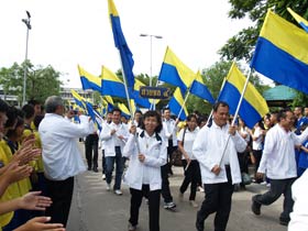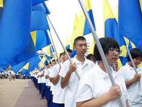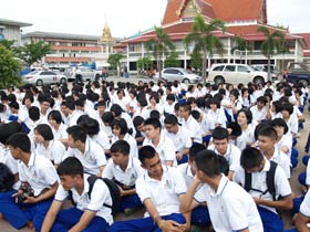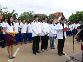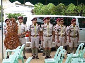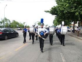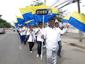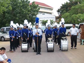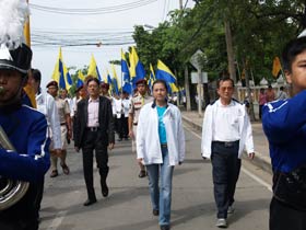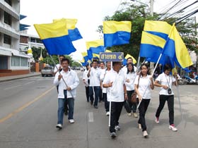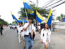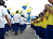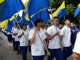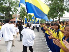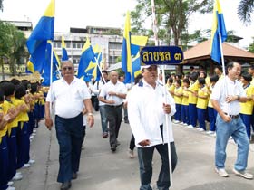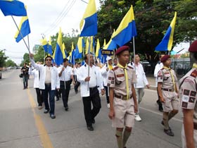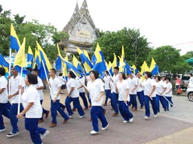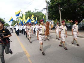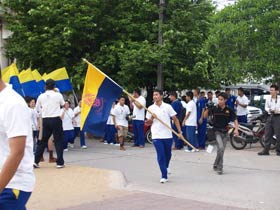 กองดุริยางค์เบญจมฯนำขบวนตามด้วยตราสัญลักษณ์ของโรงเรียน จากนั้นเป็นธงโรงเรียนที่ถือโดยท่านประธาน พลเอกเชษฐา ฐานะจาโร ถัดมาก็เป็นคณะศิษย์เก่ากลุ่มสาบชล 5 กลุ่ม ถือธงเดินตาม มีนักเรียนที่ไปคอยร่วมพิธีเดินตามขบวนมาด้วย ทุกคนต่างร้องเพลงมาร์ชโรงเรียนเสียงดังกระหึ่ม สร้างความปิติให้กับทุกคนที่ได้เห็นได้ยิน ขบวนมาถึงโรงเรียน ท่านพลเอกเชษฐา ฐานะจาโร ได้นำธงขึ้นวางยังที่ตั้งหน้าแท่นพระบรมรูป รัชกาลที่ 5 แล้วทุกคนนั่งคอยพิธีบวงสรวงที่จะดำเนินการต่อไป