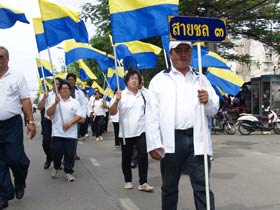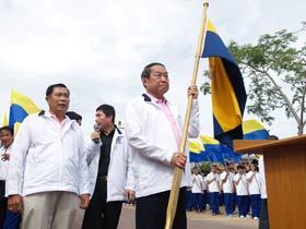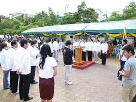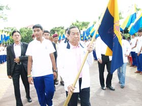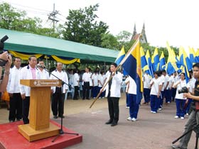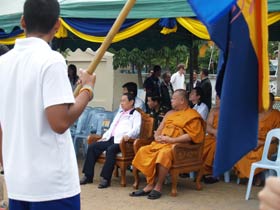 เมื่อเวลาประมาณ 9.00 น. ของวันที่ 20 มิถุนายน 2555 ภายหลังจากเสร็จกิจกรรมทางศาสนา ถวายสังฆทานแด่พระสงฆ์ 9 รูป ของวัดเมืองแล้ว ขบวนวิ่งธงจากจุดกำเนิดโรงเรียนเบญจมราชชรังสฤษฎิ์ซึ่มาจากวัดสายชล ณ รังษี ก็มาถึงยังสนามหน้าวัดเมือง ในขณะนั้นทั้งประธานคือพลเอกเชษฐา ฐานะจาโร และศิษย์เก่า พร้อมด้วยครูและนักเรียนชั้น ม.4 รอต้อนรับอยู่แล้ว มีการรายงานความเป็นมาของกิจกรรมนี้ต่อประธาน เสร็จแล้วประธานกล่าวเปิดงาน หลังจากนั้น พันเอกทวีพูล ริมสาคร อุปนายกสมาคมฯ ได้มอบธงโรงเรียนให้แก่พลเอกเชษฐา ฐานะจาโร เพื่อถือนำขบวนเดินมุ่งสู่โรงเรียนเบญจมราชนังสฤษฎิ์ ซึ่งอยู่ห่างออกไปตามถนนชุมพลประมาณ 500 เมตร