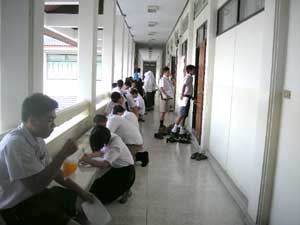เมื่อเดินทางมาถึงต่างตรวจสอบความพร้อมทั้งเรื่องห้องสอบ เอกสารแสดงตัวเพื่อเข้าสอบ ตลอดจนเครื่องเขียนในการทำข้อสอบ ซึ่งจะมีนักเรียนจำนวนหนึ่งที่ลืมเอกสารเช่นบัตรประจำตัวนักเรียน บัตรประจำตัวประชาชน รวมถึงไม่ได้พิมพ์บัตรเข้าห้องสอบมาด้วย ซึ่งด็ต้องแก้ปัญหากันเดี๋ยวนั้นเพื่อให้ได้เข้าสอบวิชาแรกที่จะมาถึงในไม่กี่นาทีข้างหน้า