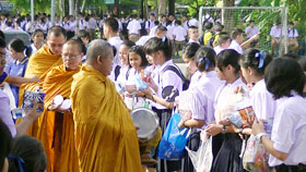 วันนี้(17 พ.ค.56) เป็นวันพระขึ้น 8 ค่ำ ถือเป็นวันมงคลที่ชาวบ้านเบญจมฯจะได้ร่วมทำบุญใส่บาตรข้าวสารอาหารแห้งในโอกาสเปิดภาคเรียนใหม่ ดังนั้นทั้งครูและนักเรียนจึงพร้อมใจกันทำบุญ ที่ความเป็นจริงแล้วชาวบ้านเบญจมฯได้ปฏิบัติเช่นนี้มาทุกวันพระนานหลายปีมาแล้ว จนเป็นที่รู้กันเองว่าเมื่อถึงวันพระทุกคนจะต้องเตรียมของมาใส่บาตรร่วมกันทั้งครูและนักเรียน ถือเป็นการร่วมปฏิบัติทางศาสนาที่สำคัญ และในวันนี้เราเห็นภาพครูชาวต่างชาติมาร่วมใส่บาตรด้วย