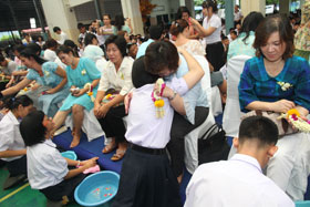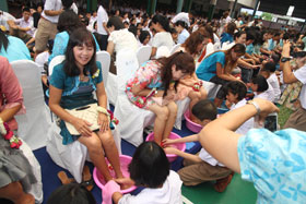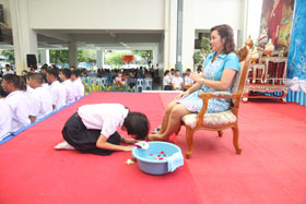 พิธีการในวันนี้เริ่มด้วยการเชิญแม่ตัวอย่างบนเวทีเพื่อแนะนำ และหลังจากนั้นคณะนักร้องประสานเสียงร่วมกันขับร้องเพลงอิ่มอุ่น ในขณะเพลงกังวานก้องอยู่นั้น ลูกๆได้นำน้ำเข้ามาหาแม่ที่นั่งอยู่บนเก้าอี้กลางที่ชุมนุมเพื่อล้างเท้าให้แม่ ในช่วงนี้เองภาพประทับใจของทุกคนก็เกิดขึ้น ที่แม่ลูกผูกพัน บางท่านกลั้นน้ำตาแห่งความตื้นตันไว้ไม่ได้ก็ต้องปล่อยให้พรั่งพรูออกมา จึงเห็นภาพแม่กับลูกกอดกันร้องให้ด้วยความปิติ