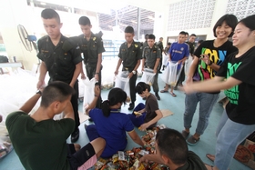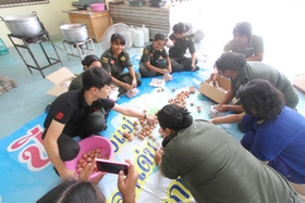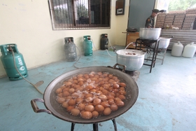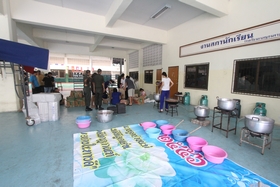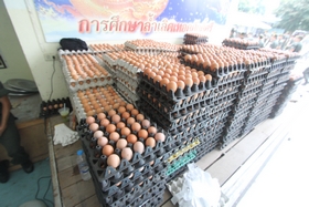 สำหรับไข่ไก่นั้น ได้นำมาต้มเพื่อให้สามารถนำไปแจกจ่ายได้ง่ายขึ้นไปแตกเสียหายระหว่างทาง แต่เนื่องจากจำนวนไข่ไก่ที่ได้รับสนับสนุนจากชมรมผู้เลี้ยงไก่ไข่มากถึง 3 หมื่นฟอง ในช่วงแรกนี้จะดำเนินการต้มไข่ก่อนประมาณ 2 หมื่นฟอง จึงต้องใช้เวลาในการต้มไข่นานหลายชั่วโมง