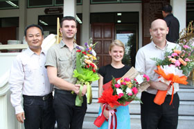 ภาษาต่างประเทศ วันนี้ (22 พ.ค.57) หัวหน้ากลุ่มสาระฯต่างประเทศ ได้นำครูชาวต่างประเทศจำนวน 4 คน ขึ้นแนะนำตัวให้นักเรียนทุกคนได้รู้จักบนเวทีหน้าเสาธง ครูทั้ง 4 คน มาจากที่ต่าง เป็นครูสอนภาษาอังกฤษ 3 คน และครูสอนภาษาจีน 1 คน โดยมีการมอบช่อดอกไม้แสดงการต้อนรับโดยรองฯสุทนต์ พรหมนิยม รองฯฝ่ายงบประมาณ เป็นตัวแทนผู้อำนวยการโรงเรียนมอบ และกล่าวต้อนรับ