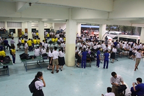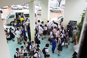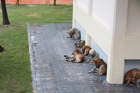 นอกจากนักเรียนจะต้องหลบฝนกันอยู่ใต้อาคารสมเด็จพระเทพรัตนฯ แล้ว น้องหมาที่มีเป็นจำนวนมากก็พากันหลบฝนอยู่ตามชายคาอาคารเรียนด้วย
