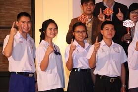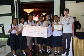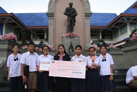 นายสุทนต์ พรหมนิยม รองผู้อำนวยการฝ่ายบริหารงบประมาณ เป็นตัวแทนผู้อำนวยการฯ รับมอบรางวัล พร้อมด้วยครูวิไลวรรณ เขียวประเสริฐ ครูหัวหน้าโครงการ ครูลำยอง ไทยตระกูล หัวหน้ากลุ่มสาระฯวิทยาศาสตร์ และนักเรียนจำนวน 6 คน