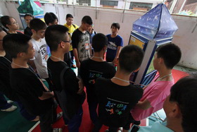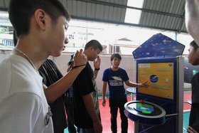 จากการสังเกตการเตรียมงานจัดนิรรศการวิทยาศาสตร์ ตามโครงการคาราวานวิทยาศาสตร์ ของ อพวช. วันนี้(14 กรกฎาคม 2557) เวลา 11.00 น. ปรากฎว่าการจัดการติดตั้งอุปกรณ์สาธิตตามโซนต่างๆ เสร็จไปเกือบทั้งหมดแล้ว เชื่อว่าภายในบ่ายวันนี้ทุกอย่างจะถูกติดตั้งเสร็จสมบูรณ์ ในขณะเดียวกันเจ้าหน้าที่ของ อพวช. ก็ได้แบ่งกลุ่มนักเรียนที่จะทำหน้าที่เป็นผู้แนะนำประจำฐานความรู้และแนะนำให้นักเรียนทั้งหมดทุกกลุ่มมีความสามารถที่จะอธิบาย หรือนำกิจกรรมแก่นักเรียนและผู้เข้ามารับชมนิทรรศการในวันที่ 15-18 กรกฎาคม นี้ ซึ่งนักเรียนทั้งหมดมีความกระตือรือร้นที่จะทำหน้าที่กันทุกคน
