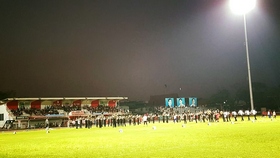 เมื่อวันที่ 3 มกราคม 2559 เวลา 17.00 น. ณ สนามฟุบอลกลาง เทศบาลเมืองฉะเชิงเทรา นักดนตรีวงโยธวาทิตพร้อมด้วยครูผู้ฝึกซ้อม และกองเชียร์ ยกขบวนไปซ้อมใหญ่ก่อนเข้าสู่สนามจริงในวันที่ 6 มกราคม 2559 ณ สนามกีซาศุภชลาศรัย ทั้งนี้เพื่อฝึกซ้อมในสนามที่ใกล้เคียงสภาพจริง ทั้งนี้มีครู นักเรียน ตลอดจนผู้ปกครองที่ทราบข่าวเดินทางมาให้กำลังใจกันมากมาย