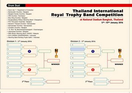 News เมื่อวันที่ 5 มกราคม 2558 ณ สนามศุภชลาศรัย ทีม Percussion ของวงโยธวาทิตโรงเรียนเบญจมราชรังสฤษฎิ์ ได้ร่วมแข่งขัน DRUM DUAL หรือ การแข่งขันประเภทประชันกลอง (Drum Dual) Division 2 เป็นการแข่งขันด้วยวิธีน๊อคเอ๊าท์ แพ้คัดออก มีทีมที่เข้าร่วมแข่งขันจำนวน 15 ทีม (ตามลิ้งรูปประกอบ) ผลปรากฎว่าทีม 8-ROW ซึ่งเป็นชื่อทีมของโรงเรียนเบญจมฯ ได้รับการตัดสินเป็นผู้ชนะในรอบชิงชนะเลิศ