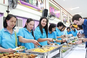 และในโอกาสนี้ทางกลุ่มสาระฯศิลปะ ได้จัดนักเรียนมาร่วมร้องเพลง และแสดงศิลปะฟ้อนรำให้ได้ฟังและชมกันด้วย... และสำหรับอาหารจัดเลี้ยงในวันนี้เป็นแบบบุฟเฟ่มีทั้งข้าว และก๋วยเตี๋ยว ซึ่งได้รับคำชมจากแขกผู้มาเยือนว่าอร่อยมาก เมื่อรับประทานอาหารเสร็จแล้วคณะครูจากลำปางก็เดินทางต่อไปยังพัทยาเพื่อจัดกิจกรรมให้ครูผู้เกษียณอายุราชการที่เดินทางร่วมมาในวันนี้จำนวน 13 ท่านจากทั้งหมด 18 ท่าน ทันที
