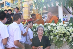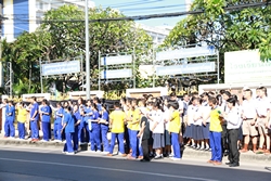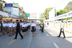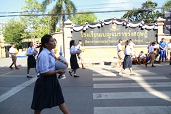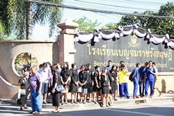 สำหรับคณะครูและนักเรียนของเบญจมฯ ได้ออกมายืนคอยรับขบวนที่แนวถนนหน้าโรงเรียน เวลาประมาณ 9 น.เพื่อรอรับการประพรมน้ำมนต์ของหลวงพ่อ และรับด้ายสายสินจากกรรมการบนรถหลวงพ่อฯ เพื่อเป็นสิริมงคลชีวิต