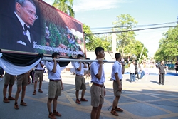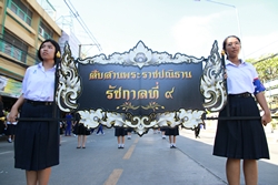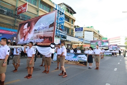 หลังเสร็จพิธีบวงสรวงแล้ว เวลาประมาณ 8 นาฬิกา รถหลวงพ่อโสธรเคลื่อนออกจากหน้าวัด โดยมีขบวนนักเรียนจากโรงเรียนวัดหลวงพ่อโสธร เป็นขบวนเดินนำ และมีนักเรียนจากโรงเรียนกาญจนาภิเษก โรงเรียนเบญจมราชรังสฤษฎิ์ และโรงเรียนดัดดรุณี เดินตามกันมาตามลำดับ โดยแต่ละชบวนนั้นถือป้ายข้อความถวายความอาลัย และโครงการในพระราชดำริ เดินตามมาอย่างสงบเป็นระเบียบเรียบร้อย