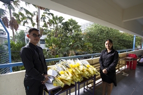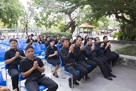 พิธีเริ่มขึ้นหลังจากเคารพธงชาติเสร็จแล้ว พระสงฆ์ที่นิมนต์มาเดินขึ้นสู่ชั้นบนของทางเดินมีหลังคาเข้านั่งยังอาสนะที่จัดไว้ จากนั้นนายสุทนต์ พรหมนิยม รองผู้อำนวยการ รักษาราชการแทนผู้อำนวยการโรงเรียน ได้จุดธูปเทียนบูชาพระรัตนตรัย ตามด้วยจุดธูปเทียนที่เครื่องทองน้อยหน้าพระบรมฉายาลักษณ์ของพระบาทสมเด็จพระปรมินทรมหาภูมิพลอดุลยเดช