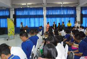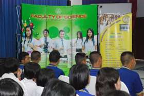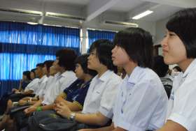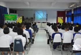วันนี้ (27 มค.) เวลา 13.00 น ภายหลังจากพิธีลงนามความร่วมมือทางวิชาการและรับประทานอาหารกลางวันร่วมกันของคณะคณาจารย์ซึ่งนำโดยคณะบดี คณะวิทยาศาสตร์ มหาวิทยาลัยบูรพาแล้ว คณะเจ้าหน้าที่กิจการนิสิตได้นำเสนอเรื่องราวเกี่ยวกับการศึกษาในคณะวิทยาศาสตร์ ให้นักเรียนชั้น ม.6 จำนวน 100 คนรับทราบ เพื่อใช้เป็นข้อมูลการตัดสินใจเลือกเรียนในสาขาวิทยาศาสตร์ที่มหาวิทยาลัยแห่งนี้