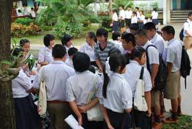 วันนี้เป็นวันแรกของการสอบ O-NET ทำให้บรรยากาศภายในโรงเรียนเบญจมราชรังสฤษฎิ์ คลาคล่ำไปด้วยนักเรียนระดับชั้น ม.6 ที่อยู่ใน สพท.ฉช. เขต1 มารวมตัวกันกว่า 2000 คน ทำให้พื้นที่ของโรงเรียนแคบไปถนัดใจ เพราะนอกจากจะมีนักเรียนที่เดินทางมาแล้ว ยังมียวดยานที่มาส่งนักเรียนจอดคอยเต็มพื้นที่เลยทีเดียว