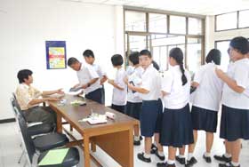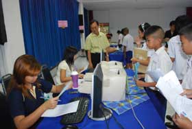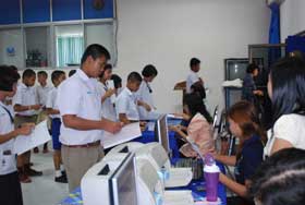 วันนี้(14 มีค.) เป็นวันรับสมัครคัดเลือกเข้าเรียนต่อ ม.1 ม.4 เป็นวันแรก มีนักเรียนมารสมัครกันล้นหลามตั้งแต่เช้า มีความขลุกขลักเรื่องใบสมัครสอบที่นักเรียนลงทะเบียนล่วงหน้าไม่ตรงวัน รวมถึงมีนักเรียนบางคนไม่ได้ลงทะเบียนล่วงหน้าแต่จะมาสมัครในวันนี้เป๋นวันแรก จึงทำให้เจ้าหน้าที่แก้ไขข้อมูลต้องทำงานกันอย่างหนักในช่วงเช้า