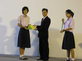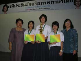 ครูฐิติมา เจริญกูล หัวหน้ากลุ่มสาระการเรียนรู้ภาษาไทย แจ้งว่าด.ญ.จุฬาพรรณ จอมศิลป์ นักเรียนชั้น ม.3/1(ปั กศ.2552) ซึ่งผ่านการคัดเลือกจากโครงการระดับจังหวัด ระดับเขต ได้รับการฝึกปรือเพิ่มเติมจากครูวิมล นันทวิจิตร และครูนุกูล สันทัดค้า เข้าแข่งขั้นระดับประเทศ ที่โรงเรียนบดินเดชา2 ในการนี้จุฬาพรรณ ได้รับการตัดสินให้รับรางวัลชนะเลิศในรายการทักษะภาษาไทย ระดับ ม.ต้น ในเวที่แข่งขันอัจฉริยภาพภาษาไทย