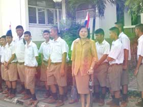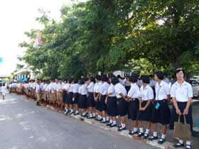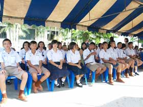 นอกจากนั้น นักเรียนระดับชั้น ม.4 นำโดยหัวหน้าระดับ คุณครูประดิษฐ์ ขมจริง ครูชนะ ทิพย์พิทักษ์ และคุณครูในระดับอีกจำนวนหนึ่งร่วมพิธีถวายพระพรอยู่ภายนอก