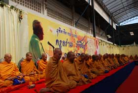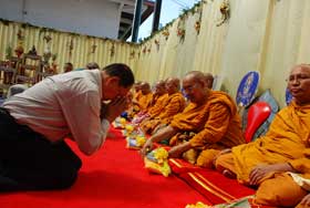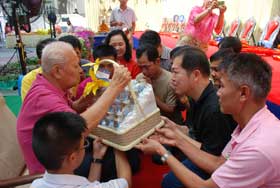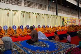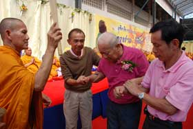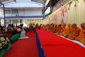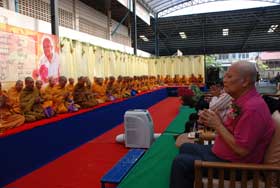 สำหรับงานวันนี้ ผู้จัดงานได้นิมนต์พระสงฆ์จำนวน 79 รูป มาเจริญพระพุทธมนต์ สืบชะตาต่ออายุให้แก่ครูอร่าม รังสินธุ์ และฉันภัตตาหารเพล มีแขกเหรื่อมาร่วมงานมากหน้าหลายตาทั้งครูเก่า ผู้เคารพนับถือ และลูกศิษย์