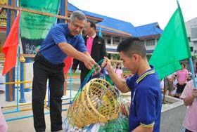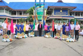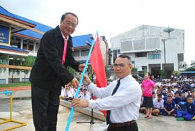 หลังจากกล่าวเปิดกิจกรรมกีฬาสีแล้ว ผู้อำนวยการได้มอบธงคณะสีให้กับแม่สีและครูประทิน สวัสดี หัวหน้ากลุ่มสาระฯพลศึกษาได้มอบอุปกรณ์การแข่งขันให้กับประธานสีทุกสีด้วย
