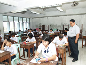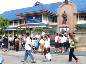 ฝ่ายบริหารวิชาการ วันนี้มีนักเรียนและรวมทั้งผู้ปกครองเดินทางเข้ามายังสนามสอบเข้าเรียนชั้น ม.1 ปีการศึกษา 2554 ตั้งแต่เช้าตรู่จำนวนนับพันคน โดยมีนักเรียนที่สอบทั้งหมดรวมในเขตและนอกเขตจำนวน 855 คน จากจำนวนผู้สมัครรวมทั้งสิ้น 921 คน ทำให้สนามหน้าโรงเรียนมีรถยนต์ของผู้ปกครองนักเรียนที่มาส่งบุตรหลานจอดกันเต็มพื้นที่ และต่างรอคอยเวลาเข้าสอบด้วยความกระวนกระวายใจ