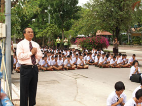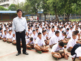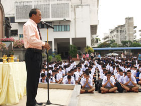 ส่วนพิธีการหน้าเสาธงวันนี้นั้น ผู้อำนวยการอำนาจ เดชสุภา ได้ขึ้นกล่าวแสดงความยินดีต้อนรับนักเรียนทุกคนเข้าสู่การเรียนในปีนี้ และอำนวยอวยพรให้ทุกคนมีความสุขในการอยู่ที่บ้านเบญจม์ตลอดไป