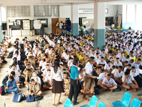 และเพื่อให้นักเรียนสามารถมองเห็นภาพหน้าเวทีได้ชัดเจนมากขึ้นโดยเฉพาะนักเรียนที่นั่งในโรงยิมและใต้ตึกสมเด็จพระเทพฯ งานเทคโนฯได้ทำการตั้งจอโปรเจคเตอร์ถ่ายทอดภาพให้นักเรียนได้ชมด้วย 2 จุดด้วยกัน