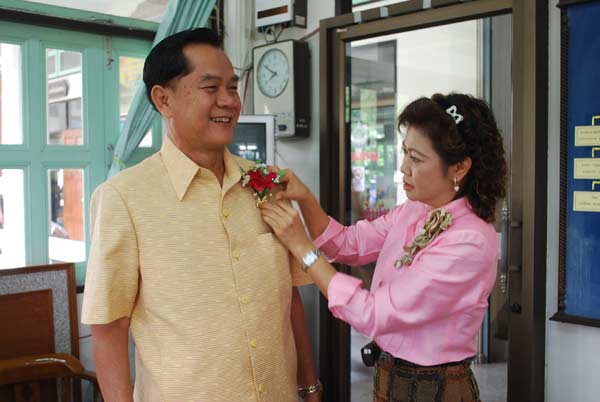 ครูจำเนียรติดโบว์ให้ครูจำนง